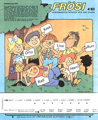 - Auf der Heftrückseite wird der FRÖSI-Spaß mit Otto und Alwin aus Heft 4/1983 aufgelöst.