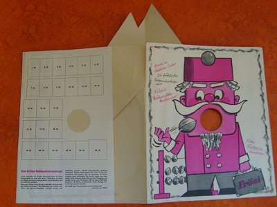 ![]() 1964 - Weihnachtsmann mit Abreißkalender, der enthält Rätselnüsse auf den Vorderseiten und Cartoons und Weihnachtstipps auf der Rückseite äußerer Heftumschlag Jürgen Kieser |