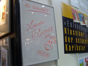 ![]() Im Gespräch mit Stefan Pannor an der DDR-Vitrine der Comicausstellung der Sammlerecke (Foto: Thowi) |