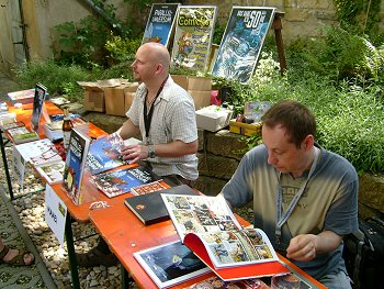 Am Stand des Holzhof-Verlages signierte Thomas Schmitt fleißig die neue Ausgabe mit den Matuffli-Abenteuern, während sein Kollege Jürgen Günther in die Otto-und-Alwin-Bücher zeichnete. Dadurch ergab sich die Gelegenheit einer kurzfristigen zeichnerischen Zusammenarbeit, deren Ergebnis auf der Exklusiv-Seite zu sehen ist.