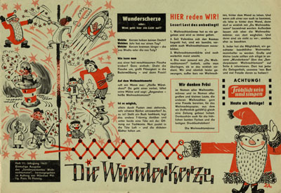 - Die 16 äußeren Heftseiten sind auf grünlichem Papier in rot-schwarz bedruckt und tragen den Titel "Die Wunderkerze"; FRÖSI wird als achtseitige innen eingeheftete Beilage angepriesen.